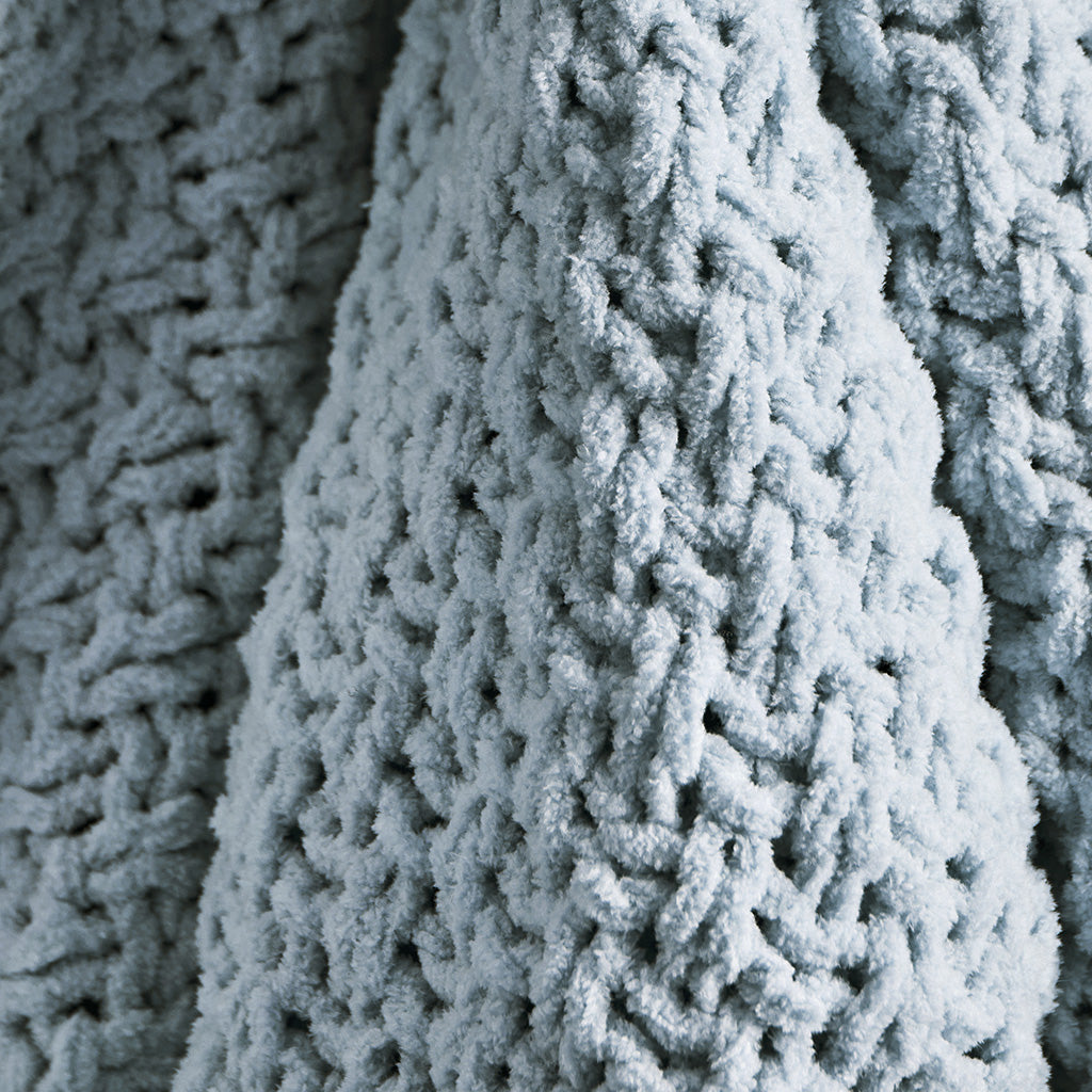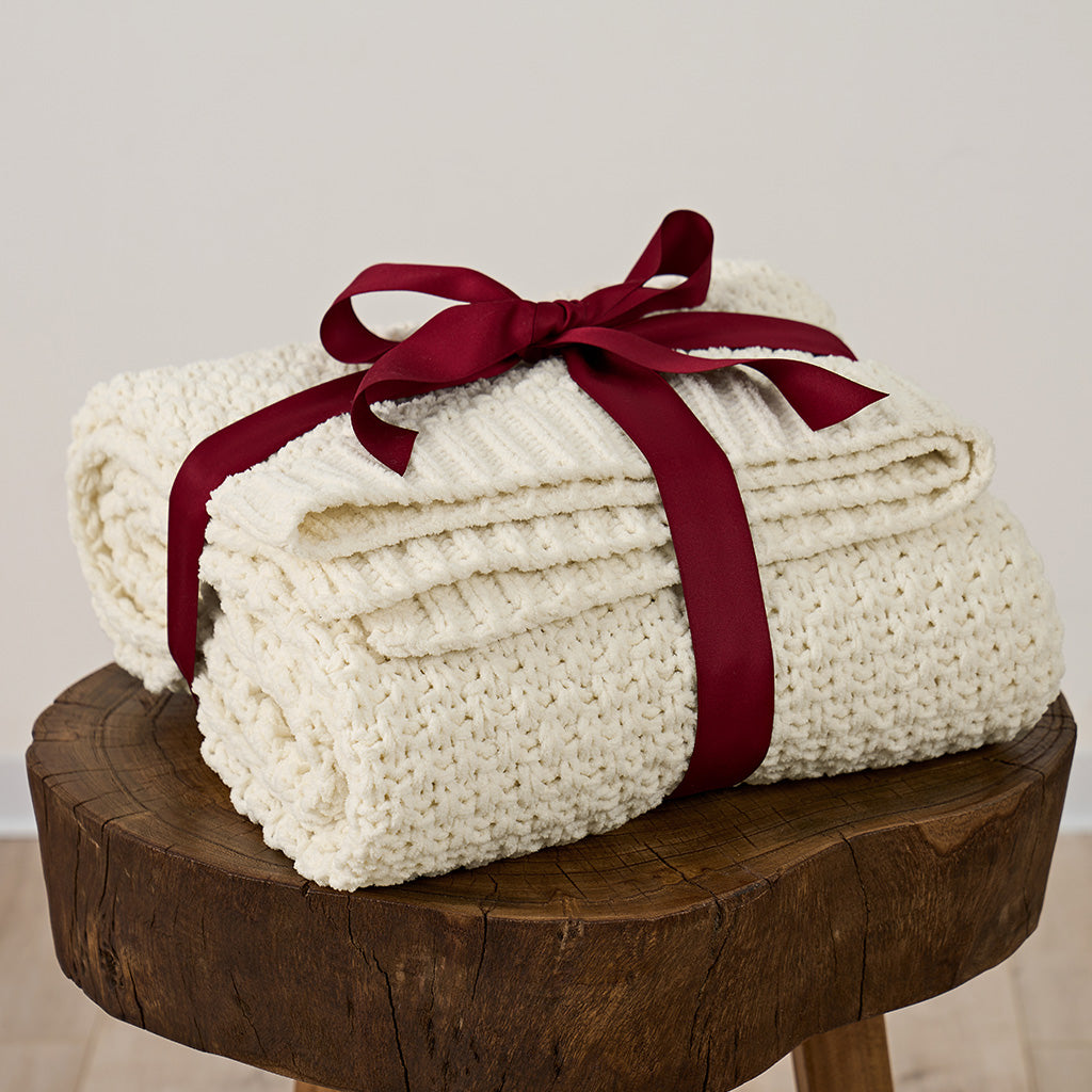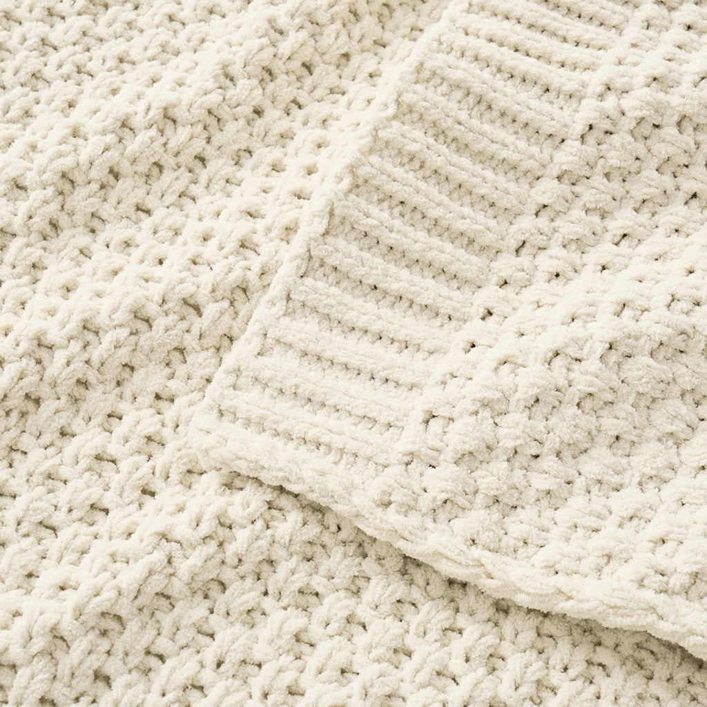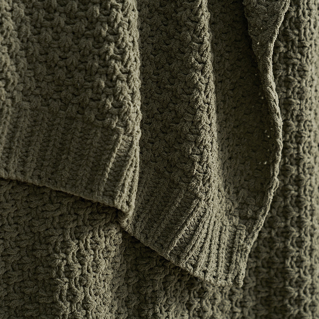 Woven with delicate moss stitches and plush chenille yarn, this solid-hued throw offers a rich, dimensional texture that feels as cozy as it looks. Soft, airy, and inviting—an effortless blend of understated elegance and everyday comfort.