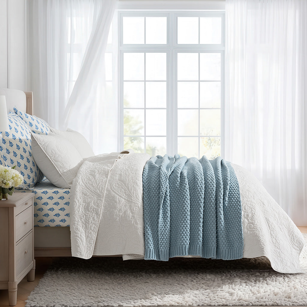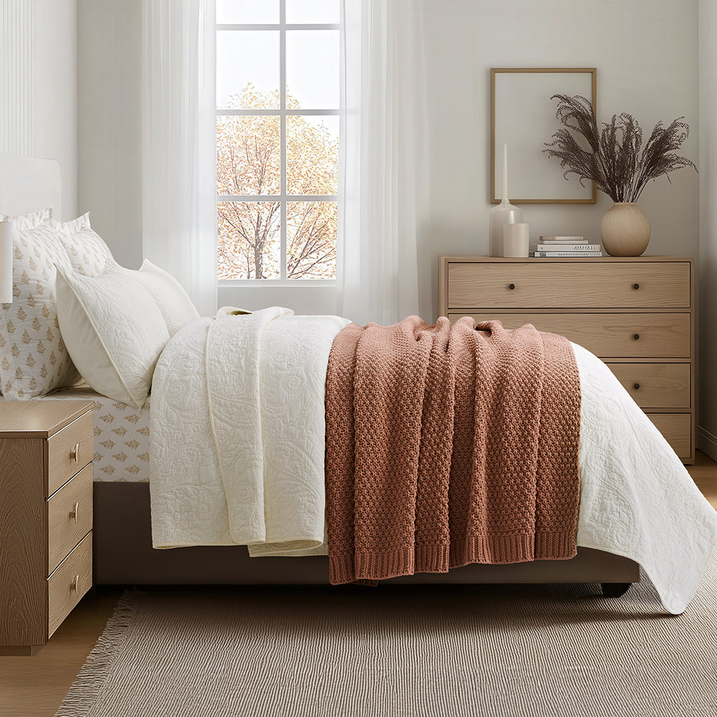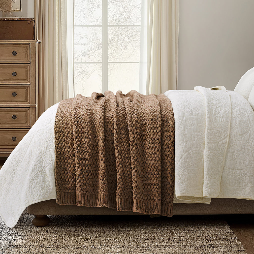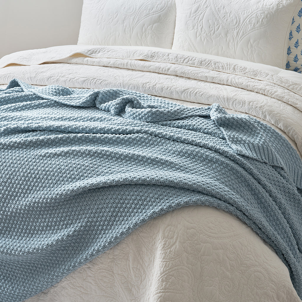Woven with delicate moss stitches and plush chenille yarn, this solid-hued throw offers a rich, dimensional texture that feels as cozy as it looks. Soft, airy, and inviting—an effortless blend of understated elegance and everyday comfort.