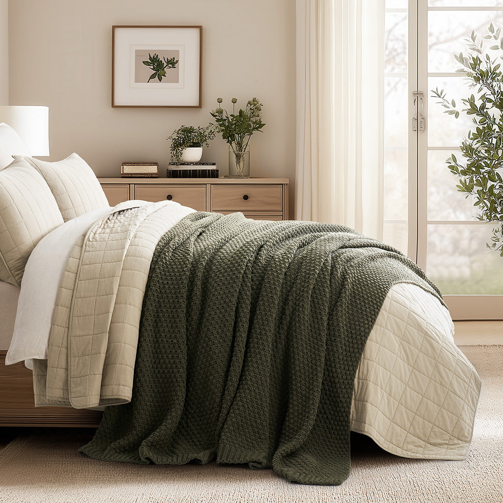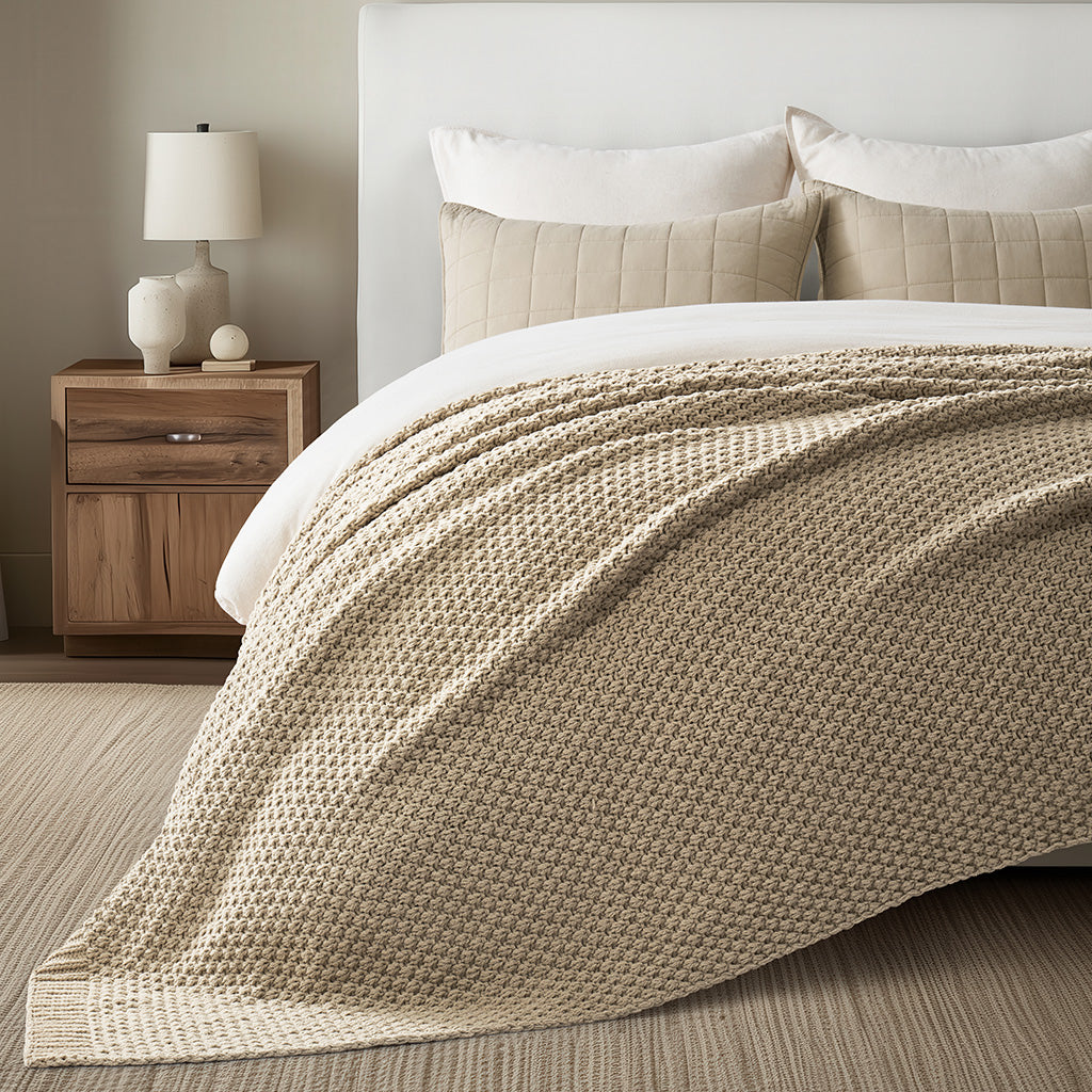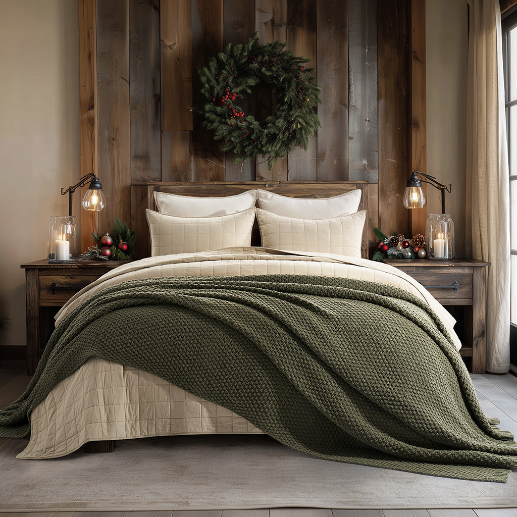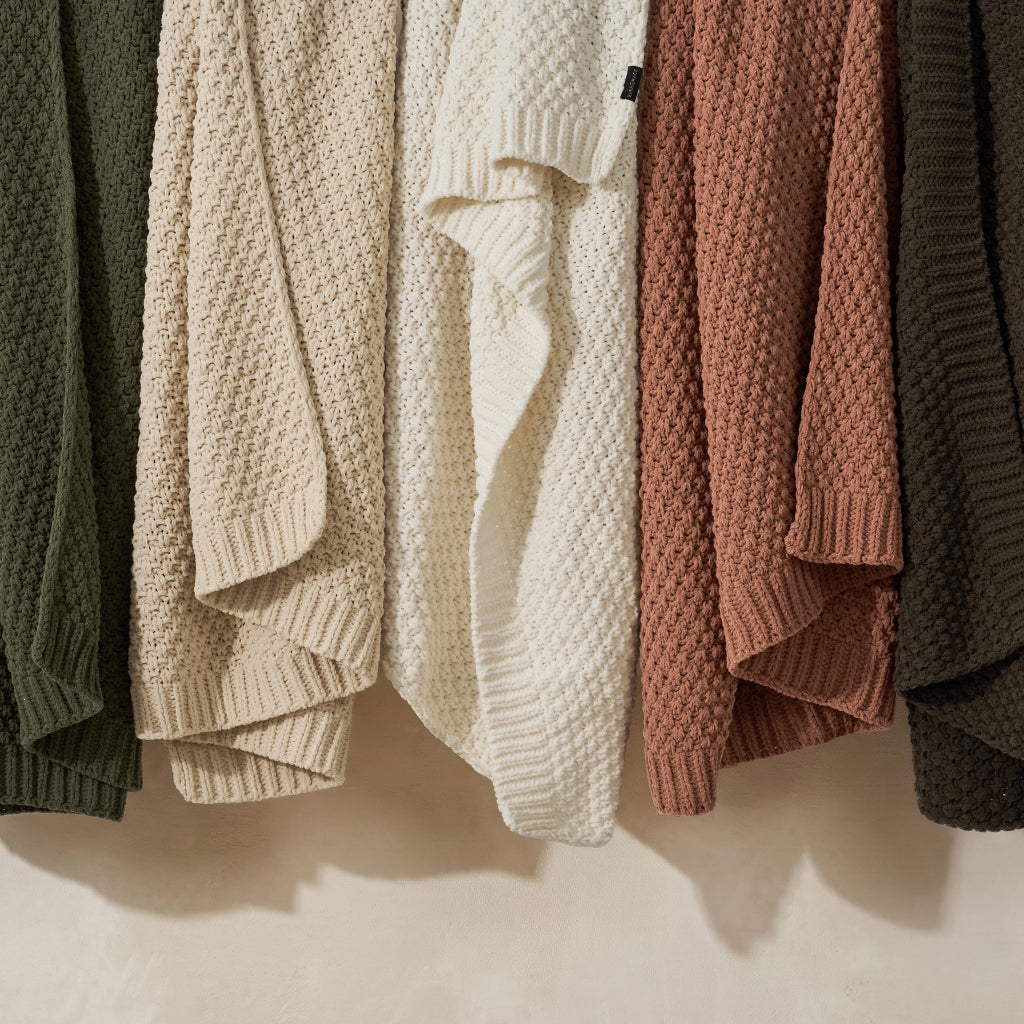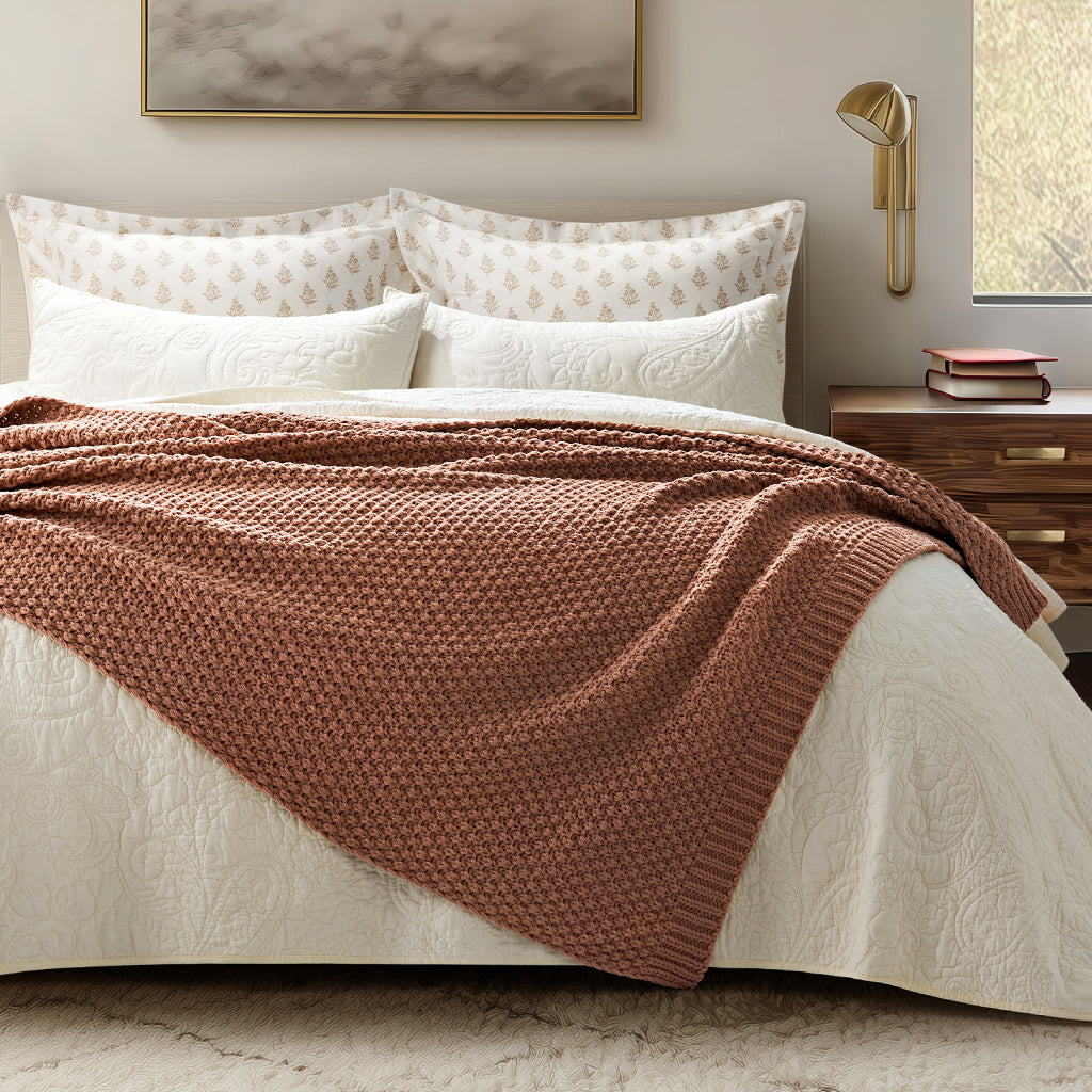 - Crafted with intricate moss stitching for a cozy yet elegant texture.